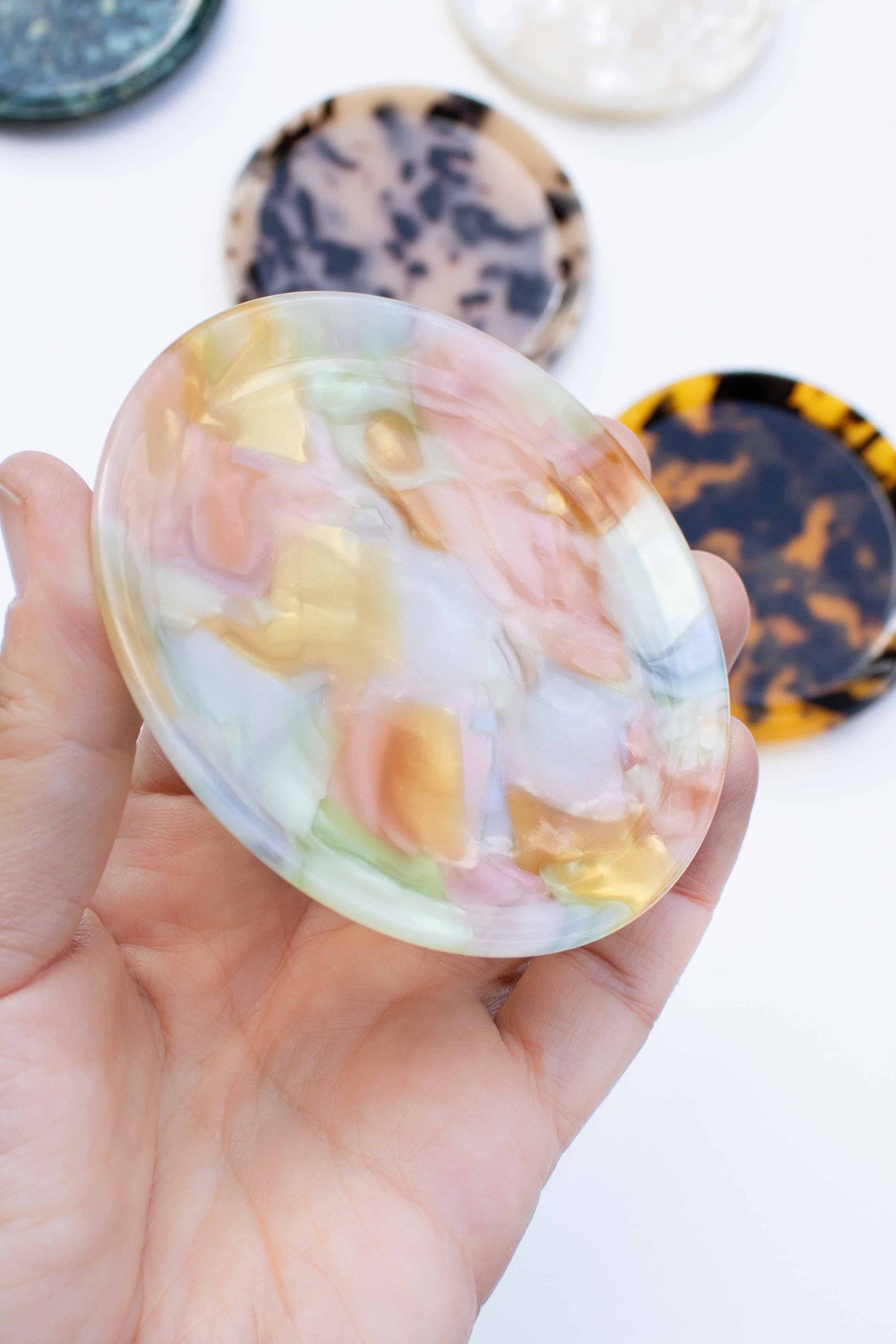 Bring effortless charm and functionality to your space with our round acetate trinket trays. Crafted from premium cellulose acetate, each tray features a unique marbled pattern—ranging from soft pastels to bold tortoiseshell and pearlescent finishes—making every piece truly one of a kind. Product Details: Material: High-quality cellulose acetate Size: Approximately 8.5 cm (3.5 inches) in diameter Design: Lightweight and glossy with a smooth, rounded edge Function: Perfect for organizing jewelry, keys, coins, hair clips, or small desk items Style: Each tray has its own unique marbled look—no two are exactly alike These acetate trays are not only practical catchalls but also add a decorative flair to your vanity, nightstand, or workspace. A stylish gift for friends or a beautiful treat for yourself!