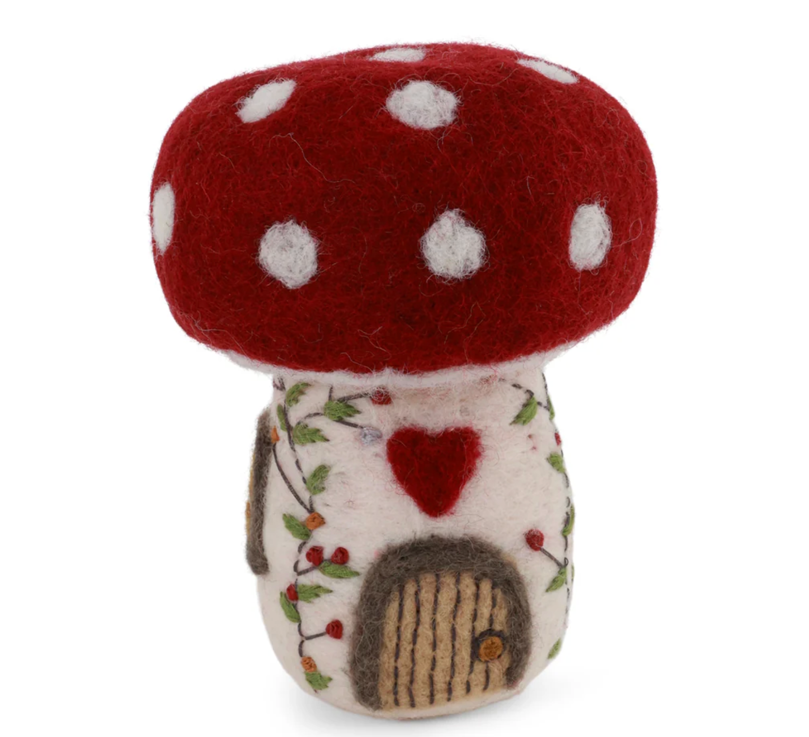 Step into a fairytale with the Gry & Sif Mushroom House Decoration – Medium. This delightful felt mushroom features a bright red spotted cap, a stitched doorway and whimsical details including vines, berries and a sweet red heart on the front.