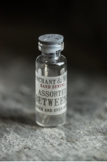 More widely used in quilting nowadays but still the best needle choice for easy handling when sewing hems. A mixture of 12 slightly different sizes encased in a Merchant & Mills glass vial with rubber stopper.