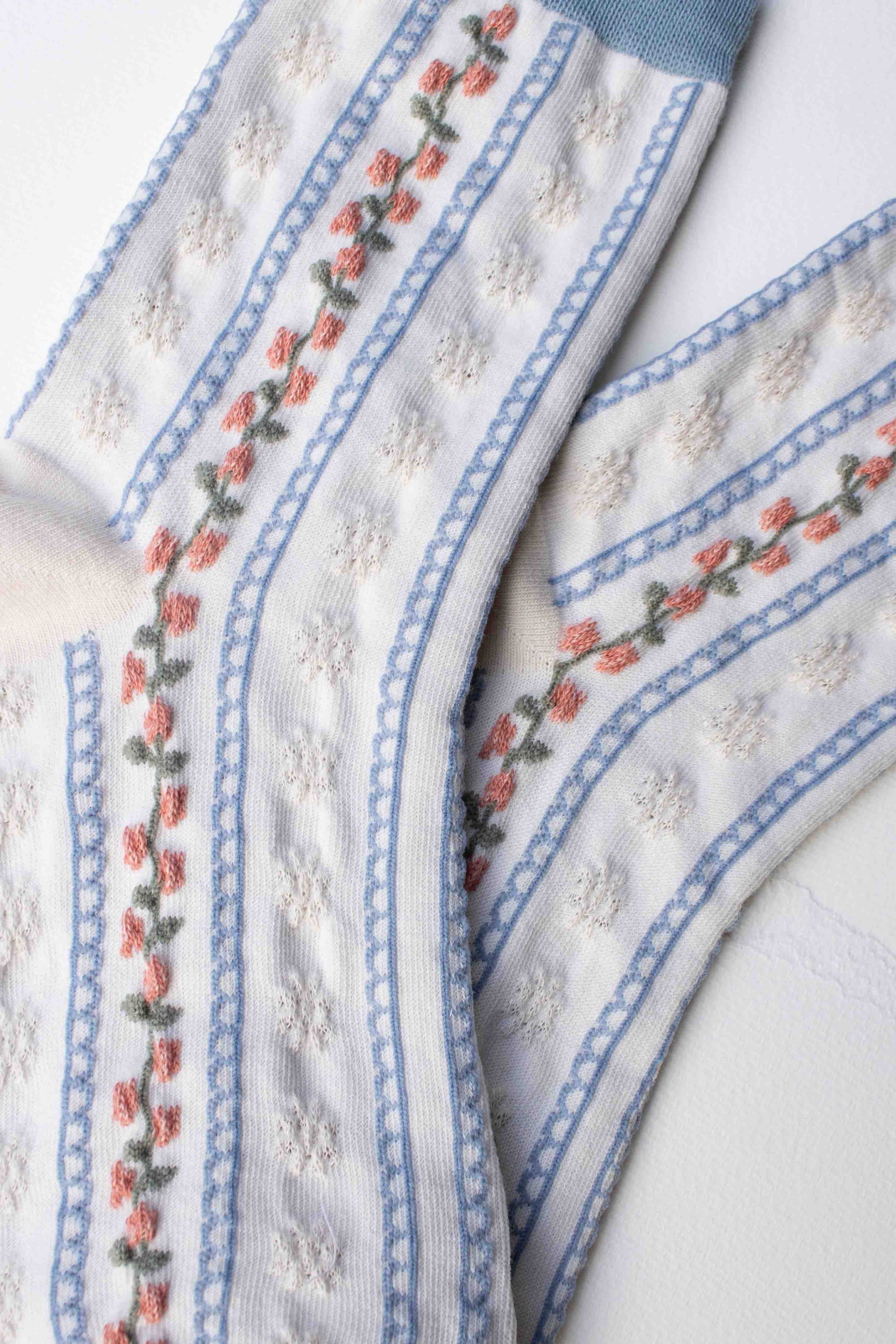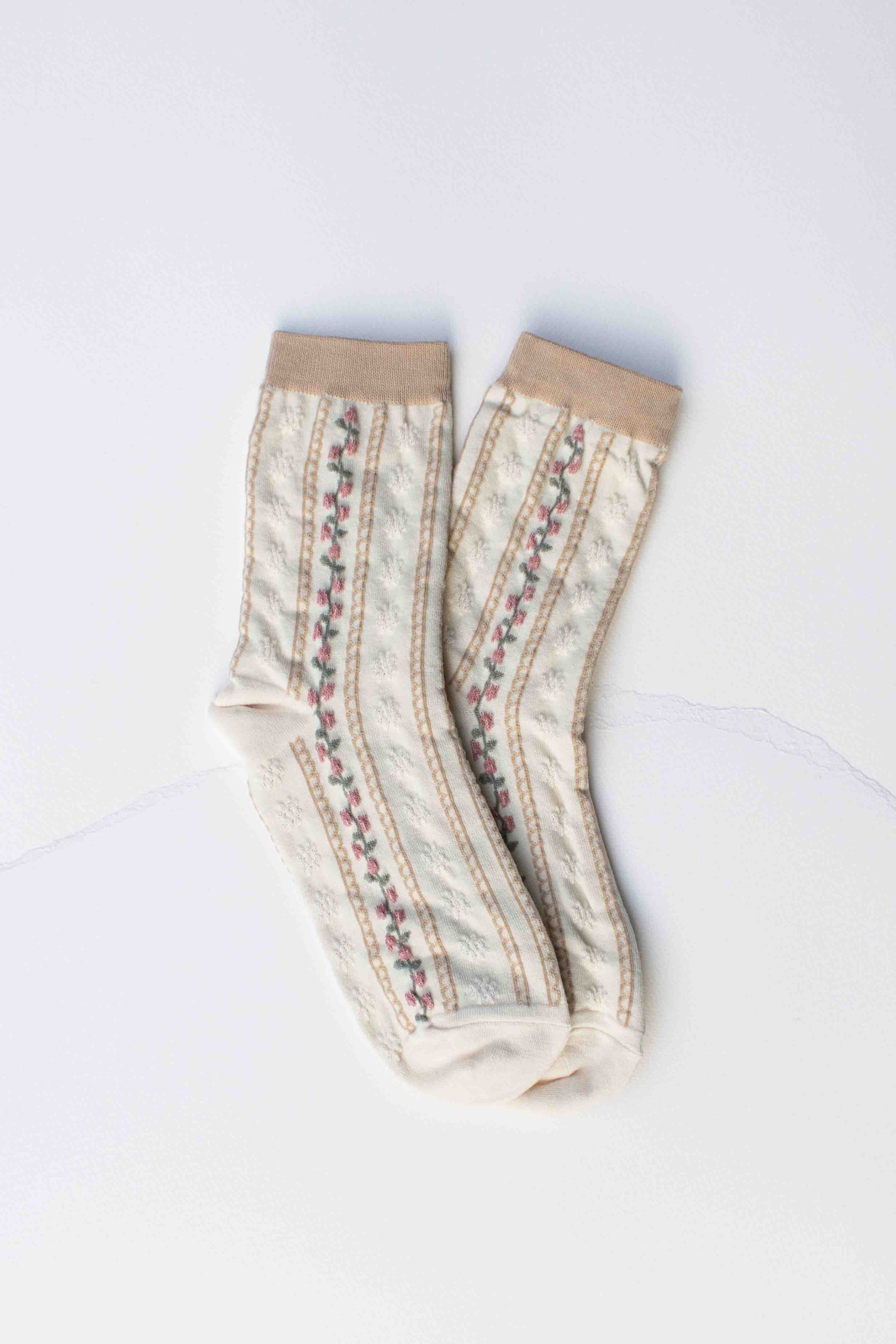 Add a touch of vintage charm to your everyday look with our stripe floral socks. Featuring delicate embroidered-style floral patterns running down each side, these socks combine comfort and timeless elegance. Perfect to wear with sneakers, loafers, or boots.